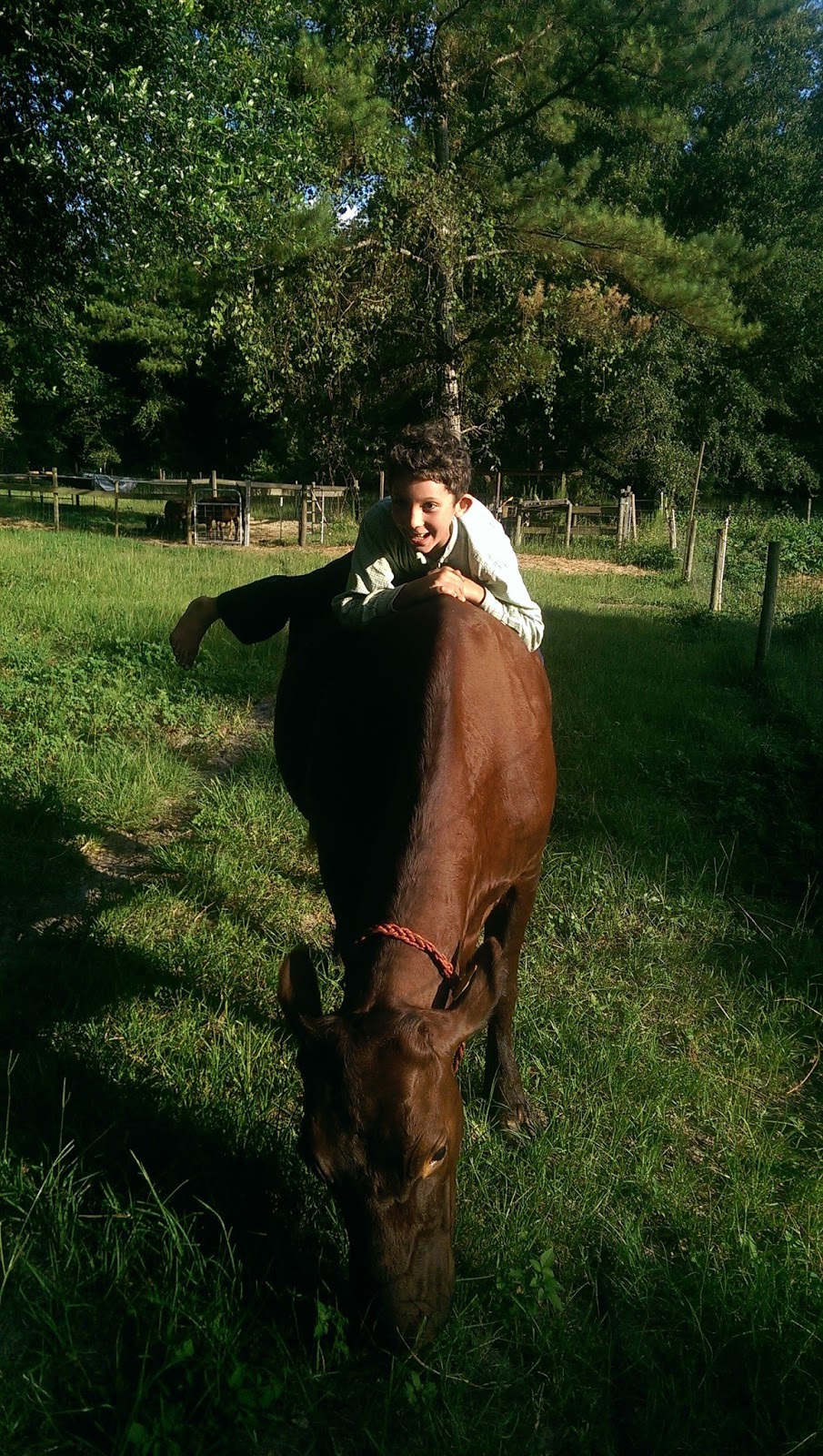 Matilda is always a pain to bring back after being milked. If they are grazing on the eastern half of the farm, it is easy to move the other cows and she gets desperate and hasty to get there first and eat more than they do. But she has been the sweet-mannered, obedient one lately (in comparison). It does take both Ethan and I to get her back, but that’s only because she has no respect for me. I’m mud, and she’s too shy of Ethan to let him lead her back. Therefore I work the gate, he shooes, and it works very well most of the time.