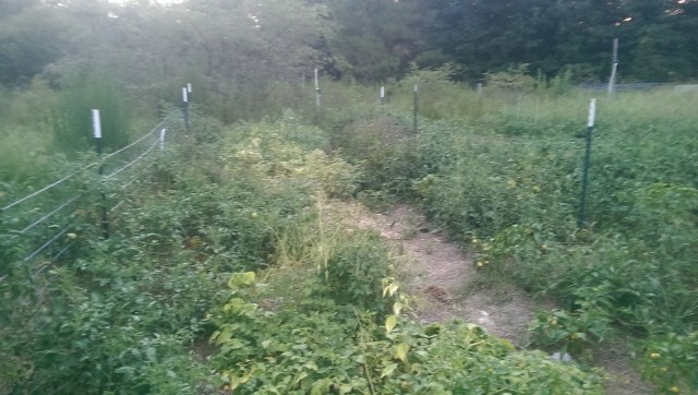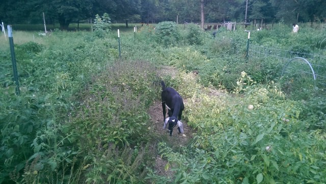 Well, it’s Thursday again, and Night Hawk is cute, but it’s been awhile since I mentioned the garden. The truth is, I’m disappointed with this year’s garden. I did not have time to really care for it properly, and now it is becoming frustrating to walk around in it. It is wild, jungly, rambling. Bugs are rampant. The squash are dying. Rabbits run away from me into the tomato hedge. Instead of killing myself in the heat to try to fix what is at this point an impossible mess of weeds, I’ve decided to let it go and focus on the fall/winter garden instead.