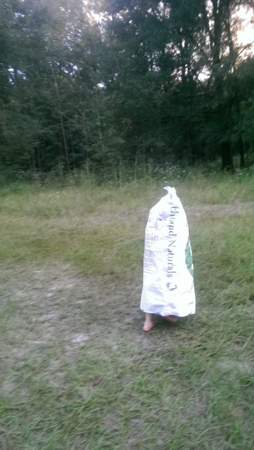 | Clothilde realized you can go WAY faster if the sack goes on the other half of you. (She caused a few accidents on account of not being able to see where she was going) |