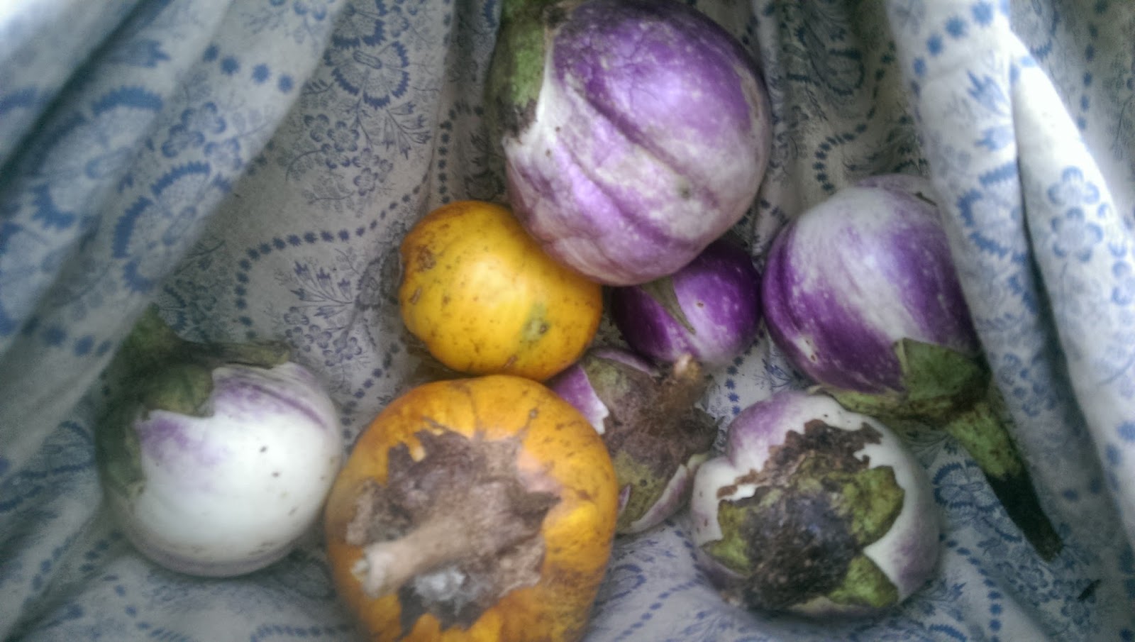 The eggplants and peppers are feeling the same way I do – they are coming back to life and flowering again. I was surprised to find so many eggplants on them (I picked the yellow ones for seed – I don’t think they would be edible at that point). I also found several Alma paprika peppers ripe (not pictured because I ate them – unwisely, as it turned out. I didn’t realize they could get that spicy! My face was numb for quite awhile afterwards.)