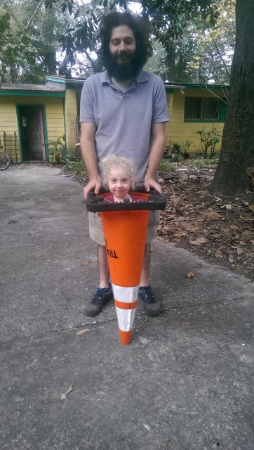 | Clothilde jammed herself in the orange safety cone we keep for slowing down traffic when the kids are riding bikes in front of our house. |