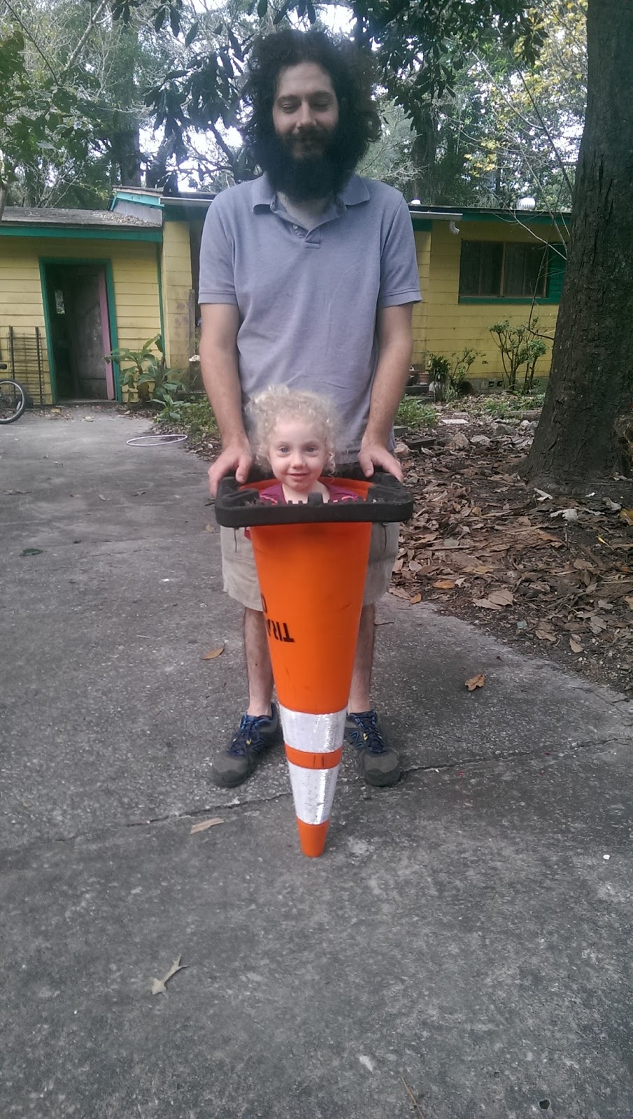 | Clothilde jammed herself in the orange safety cone we keep for slowing down traffic when the kids are riding bikes in front of our house. |