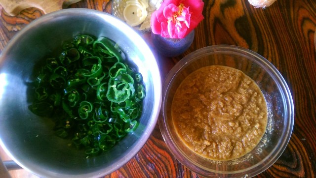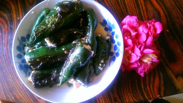 We stopped by our friend PJ’s house the other day while we were on her side of town looking at a chest freezer we found on Craigslist. She loaded us up with more grapefruits, showed us her chickens and her garden, and insisted we take all the pablano peppers that loaded the five or so bushes she had still going. They turned out to be fairly sweet. We stuffed them with homemade chevre and home-brined ham and flamed them under the broiler in the oven. They were so good!