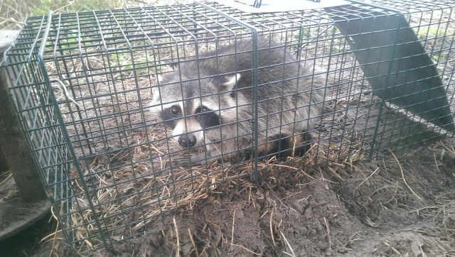 | We finally caught this raccoon who has been raiding the dog food – another unwelcome guest! |