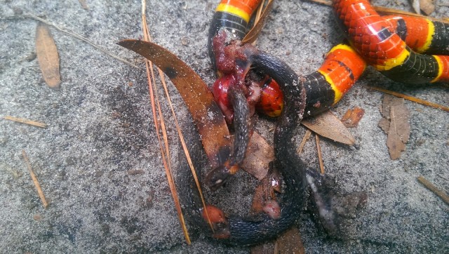 The coral snake had a smaller, ring-neck snake that had busted out of it’s side, but was all dried up, as though it had struggled out, killed the coral snake, but then died.