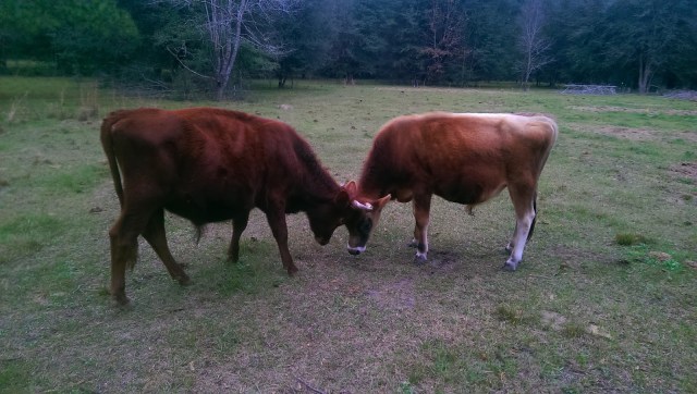 | Sampson and Nutty, the two biggest bulls now, spar to see who’s the biggest |
