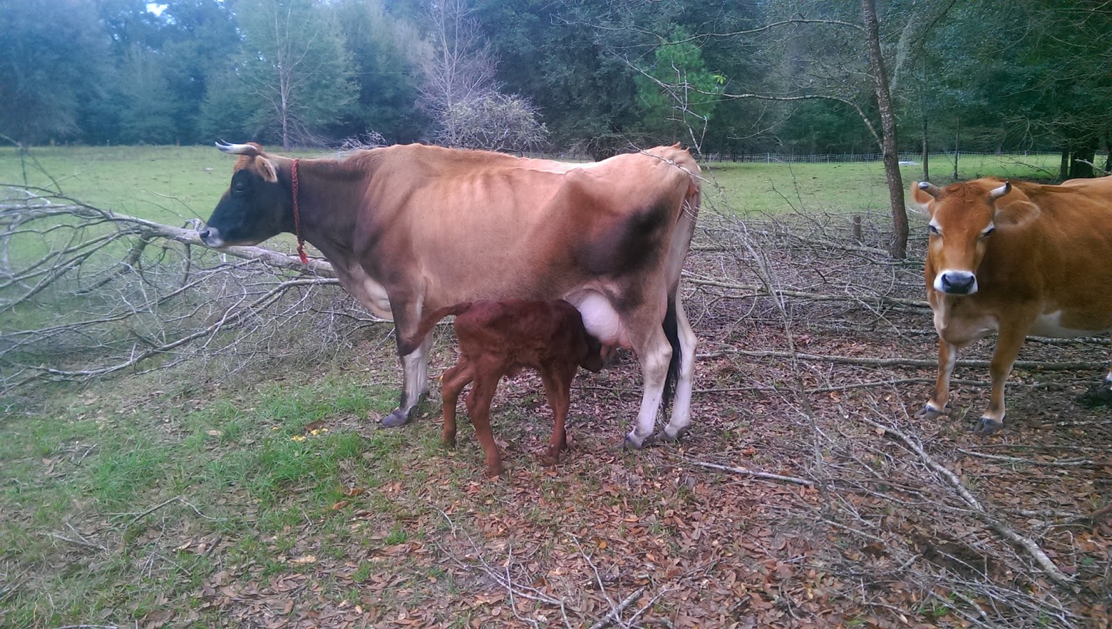 After Explorer left, I asked Ethan to see what he thought about the calf. We walked up together, and found him in the same place, same position. Not sleeping, but curled up tightly. We both rubbed his back and tried to get him to move. He seemed to curl up more tightly. Finally, Ethan scratched around on his head, and this annoyed him enough that he stood up. Matilda had come over to see what we were doing to him. He wobbled over, pooped a big, yellow colostrum poo, and started nursing.