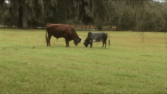 And instead of getting down to business and breeding the new cows he’s in with, he jumped the fence to pick on a mini-Zebu bull in the next pasture! PJ sent us a picture. Bully! Ken will be running a hot wire along the fence this time, and hopefully he’ll stay in and behave himself.