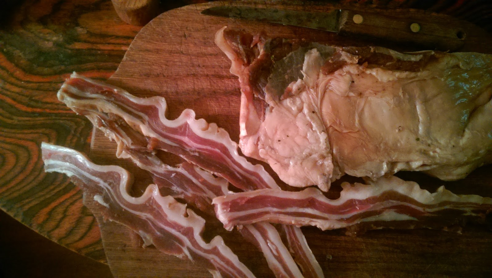 Inspired by the River Cottage Curing and Smoking Handbook, Ethan cured some bacon last week. It’s good, but not quite what we expected – it’s a little heavy on the juniper berries and bay leaf. Not bad at all, but I guess we’re used to Southern-style bacon. We’re going to try it again with different seasonings. This bacon was on the lean-side, too. And it’s been in the freezer for ages, so I guess we’re lucky it turned out edible at all.