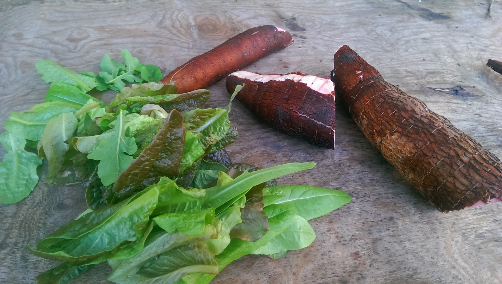 Something green from the garden, some cassava roots – just add a roast or soup and there’s dinner. We still have a couple of rows of cassava left. We seem to go through a root-system a week. I peel it and soak it in changes of water, and this seems to improve the flavor a lot. The bitterness soaks out, and I can smell the cyanide in the water the first few days. It gets more tender and potato-like.