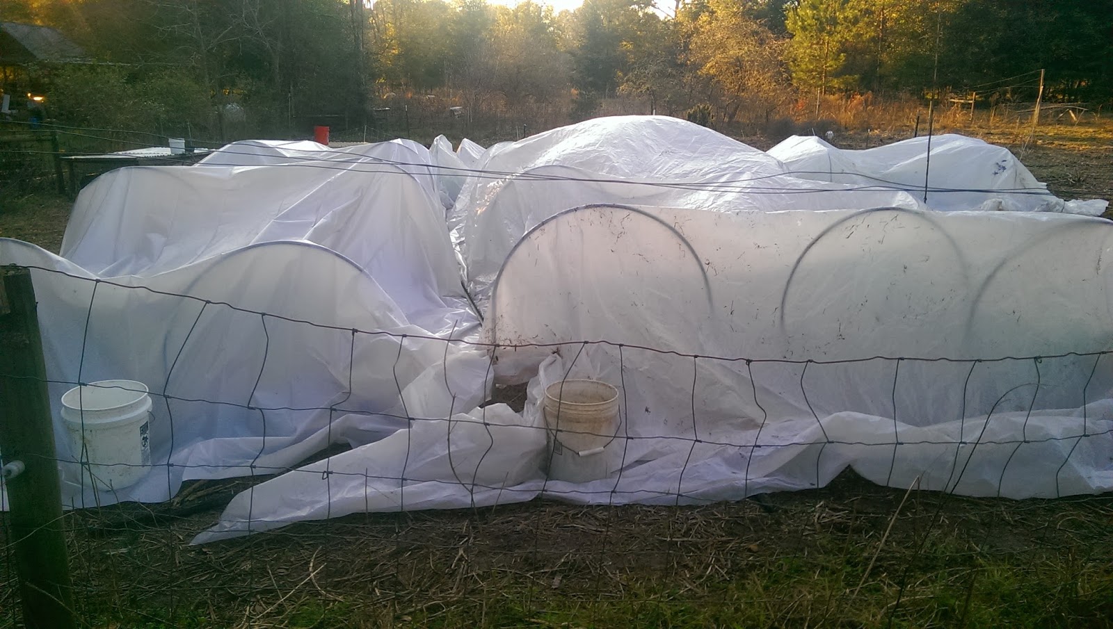 This is what my garden looks like right now, sheltering under hoops with plastic. The hot weather made me lazy this year, and I didn’t get the cold protection set up ahead of time. Instead, we had to fumble around just before dark getting things set up for the first cold snap. We didn’t do a good job of it – or maybe I didn’t plan the garden layout very well (a possibility) so now it’s nearly impossible to walk around in the garden when the plastic is off without getting barricaded in by metal hoops.