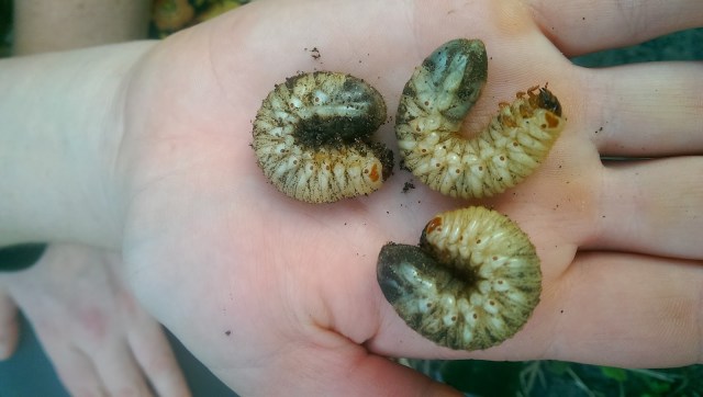 These grubs just emerged from my onion patch one day.  They had the most interesting way of scooting on their backs to move around.  I wasn’t sure what they were, but I moved them out of the garden in case they ate roots.  Ethan looked it up, and, as we suspected, they were cicada grubs.  That same evening, a huge bug that I never got a good look at (but it sounded like a cicada) kept flying at me when I was in the garden.  We joked it was the mother cicada, mad that I had moved her children.