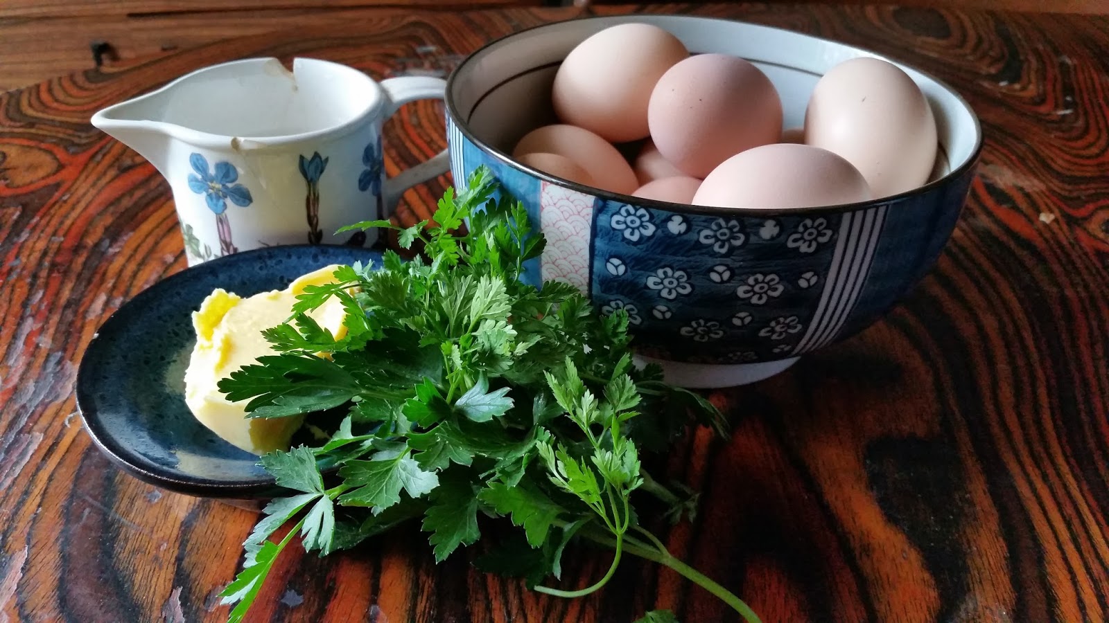 I often make omelets for breakfast, and I thought I knew quite well how to cook them. Following this recipe, however, the omelet turned out extra good. I was also glad to find a recipe that called for chervil, as it is still thriving well in my garden.