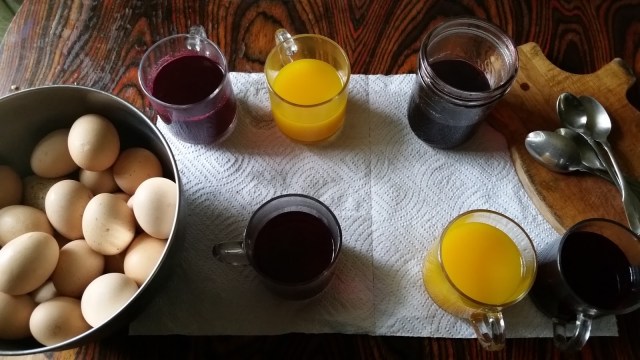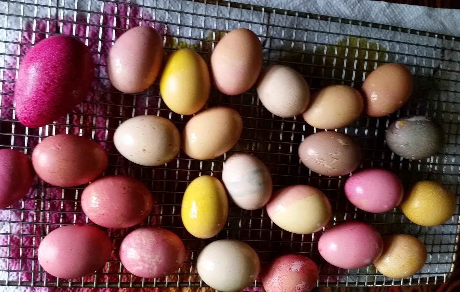 I kept escaping into painting blown eggs for the Easter tree. We were so busy on Saturday, we didn’t get to dye eggs until Sunday morning. I made dyes as usual, and everyone was disappointed how faint they were on the brown eggs. There was talk of getting a small flock of white egg layers just for Easter, but Ethan made the comment that he wasn’t going to deal with stupid chickens for 365 days a year just so we could dye the eggs for Easter. It’s true that the white egg layers we have had are all very stupid. The Barred Rocks are such good, hearty chickens, and very intelligent, but the brown eggs didn’t take the dye as well.