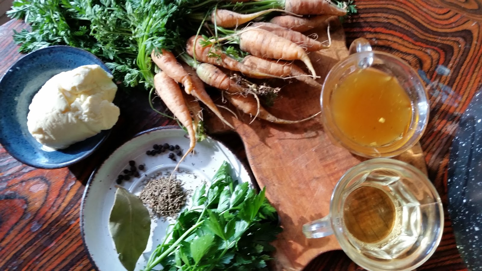 2. In a pot, bring the broth and white wine to a boil. Add the carrot slices. Season with salt and pepper and add the parsley, thyme and bay leaf. Cook until carrots are soft.