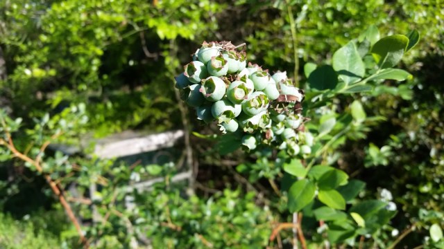 Despite our years of neglect, the orchard seems to be having a good year so far.  The early blueberries are just beginning to turn purplish.  No one can wait until they are properly blue.  The girls go through every day and pick every one that even thinks about turning color, and offer up a handful each of sour, greenish berries.  Soon they will all be turning, and we won’t be able to keep up with picking them – the children, no longer amused by the novelty, might even complain about being sick of them.  I don’t understand it, just like I can’t understand how they could be sick of watermelon, sausage, or steak.
