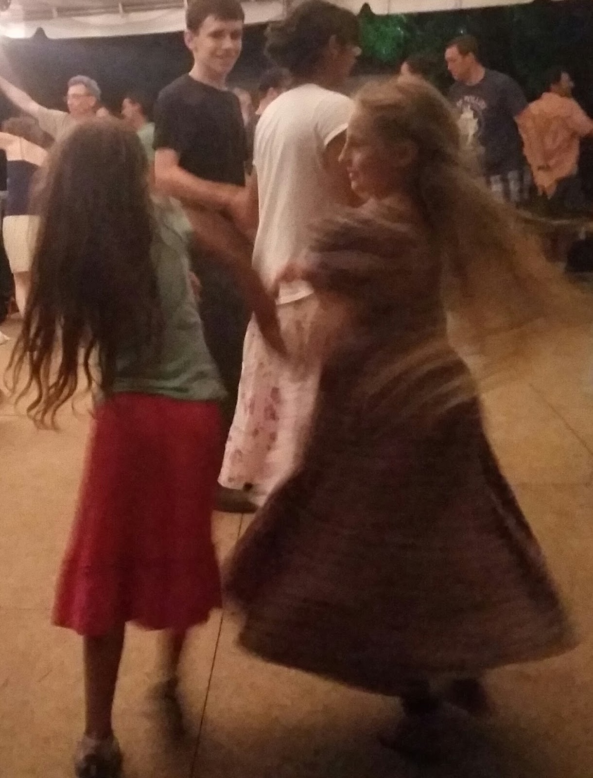 Sunday evening we went to the contra dance. It was the first time I was able to dance since Mirin was born, having since then either had a small child clinging to me, or been pregnant and not up for it with the heat. I used to dance all weekend long, as long as there was dancing. Now I’m old and out of shape and had to rest out several dances. Mirin and Rose also joined in, which made me happy beyond words to see my children enjoying something that I had also loved when I was young.