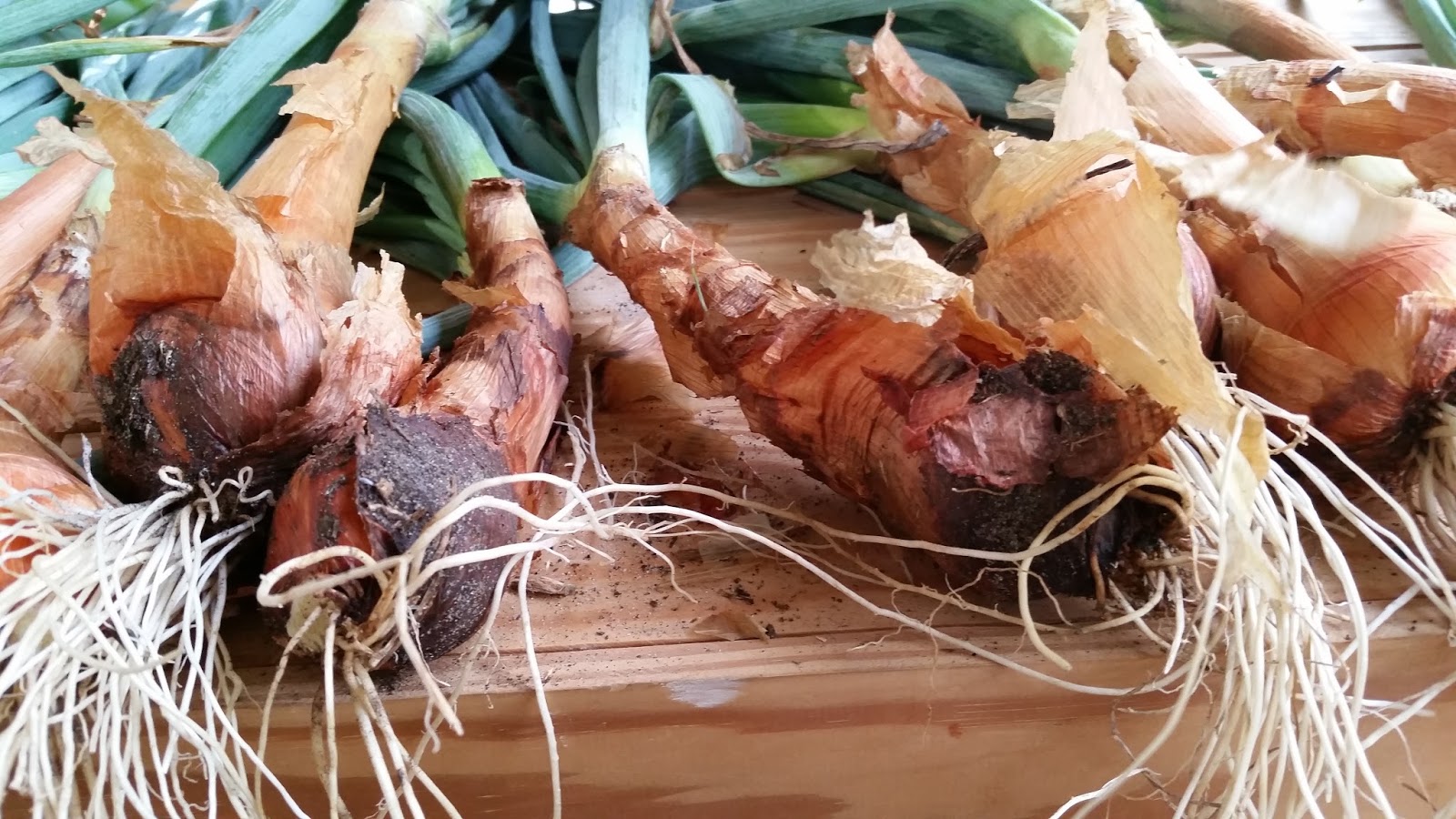 We got a lot of each kind – red, white and yellow, and they are drying under the barn. We’ve never had onions get to this stage yet – usually we eat them all or last year they rotted because I planted them between other things, and it was a choice between watering the onions and having them rot, or letting the rest of the spring vegetables wither up and die. Ah…the lessons from gardening!
