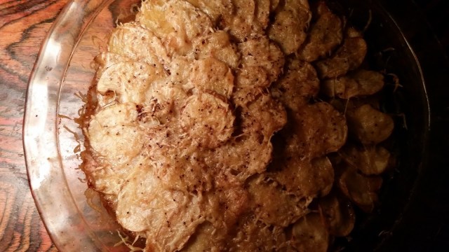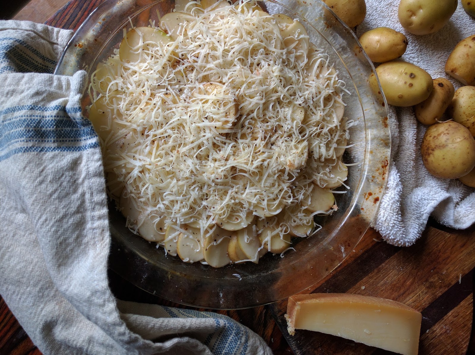 Other recipes I have read with potatoes layered with cheese and baked also call for cream, or butter, or some sort of creamy-eggy mixture poured over. My father-in-law makes an excellent version, with shallots. So I was all ready with cream skimmed from the milk, fresh butter, and of course WAY too many eggs on hand so close to the summer solstice, and was all thrown off by the lack of cream, or butter, or even eggs in this recipe. In fact, the only liquid added is half a cup of wine.
