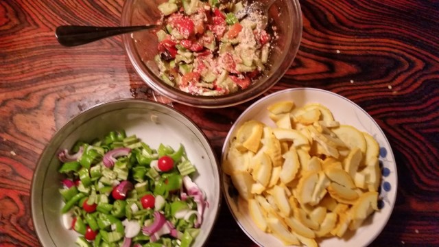 There is a considerable shift on our table, as well. Late spring meals tend to be eggy, and on the meat-and-potatoes side…all the green stuff in the garden having bolted or turned bitter. Now almost everything we eat comes from the garden. It’s not just a salad – it’s green beans, squash, cucumber and tomato salad, fried green tomatoes, Malabar spinach, AND collard greens – in the same meal. You can’t save it for later, because there will be too much. As Ethan said one year, in the midst of plenty, “Lazy Lips Sink Ships.” I will certainly be pickling next week.