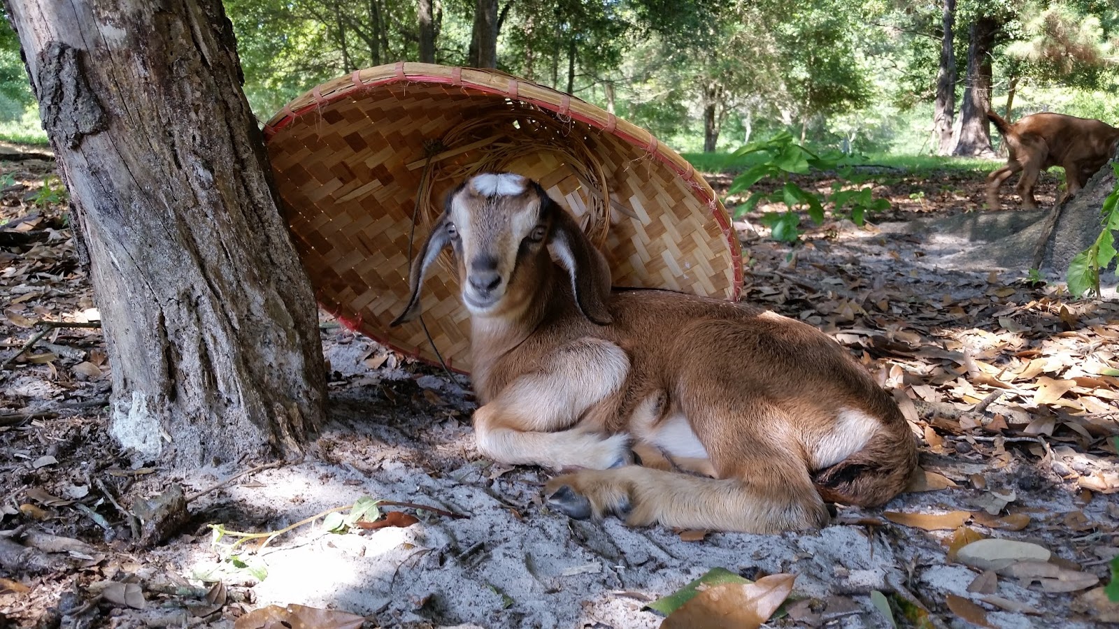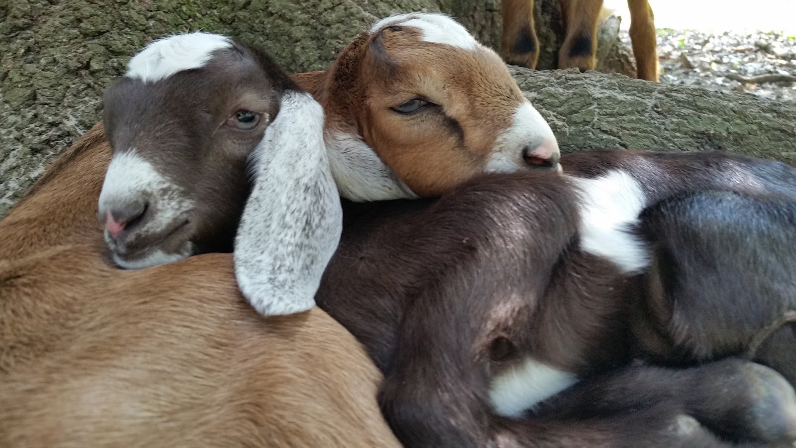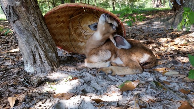 The oldest kids – Mab and Titania – are old enough to be very frisky and tear around. The other newer babies will join in for awhile, and then curl up for a nap. Mab was in a tree yesterday. It’s a live oak with rough bark that she can find footholds in. We tried to get a picture, but when she saw us she jumped down and raced away, pronking. They are so spastic at her age. They bounce around and then stop, as if they were surprised at what they have just done.