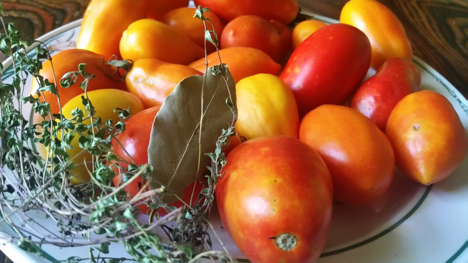 Wash six large tomatoes, cut them in pieces, put them into a pot with a bay leaf, a sprig of thyme, a head of garlic, and an onion cut into rounds.