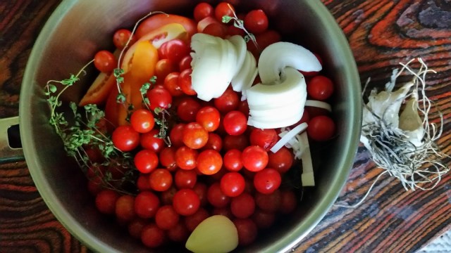 It was not difficult to change the recipe to also accommodate cherry tomatoes. I tried for Estimated Tomato Volume (I eye-balled it).