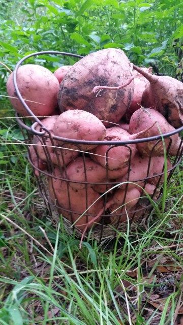 Ethan discovered that the sweet potatoes were ready to pick. This looks like a record harvest this year. They are huge. It’s funny because I was sure we wouldn’t get any at all. I planted the slips and then got so busy with everything this year I barely even watered them They are so weedy, you can hardly tell there are sweet potatoes growing. I think this actually helped them develop, because it kept the vines from rooting in other places while they were struggling with sunlight competition with the weeds.
