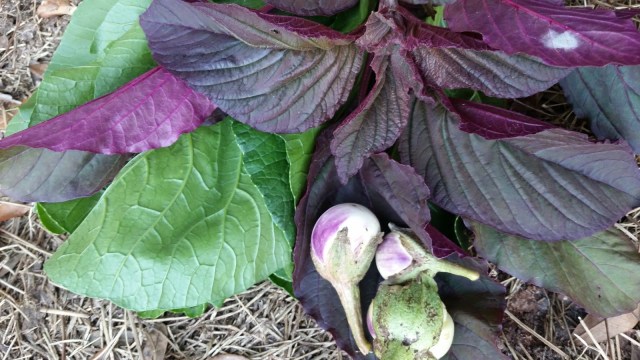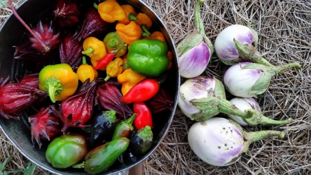 The first frost last night prompted us to glean what we could from the remainder of the summer garden – mostly roselle, small eggplants, and fiery-hot peppers. A beautiful magenta amaranth plant that had volunteered in the winter garden was harvested for soup greens. Ethan pulled up the entire hot pepper plants to finish harvesting after dark at home. There were just too many little peppers.
