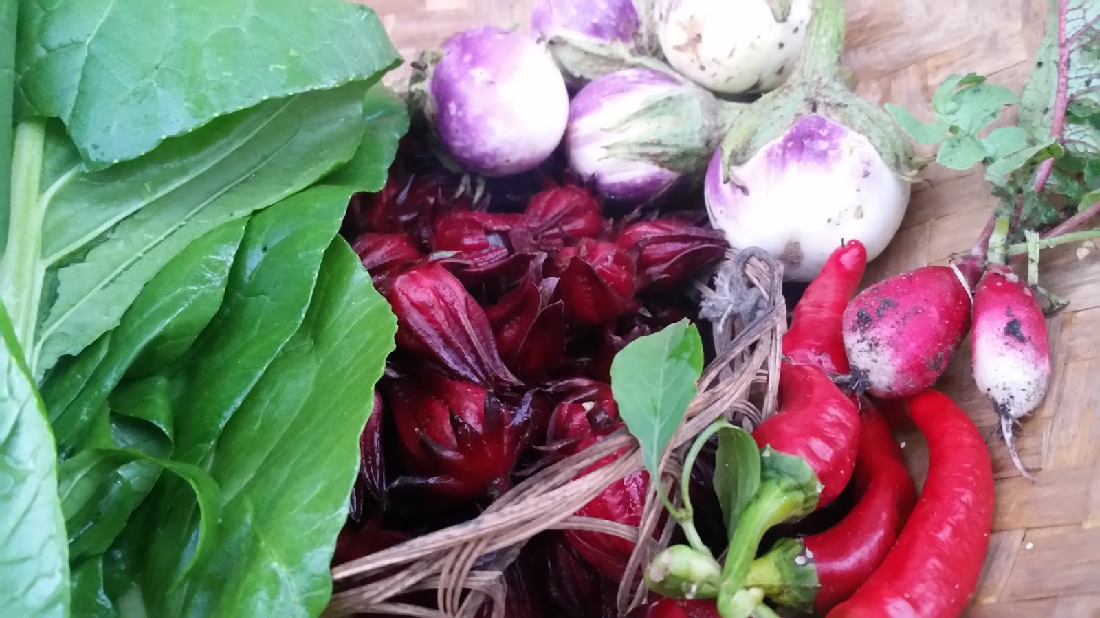 The first frost last night prompted us to glean what we could from the remainder of the summer garden – mostly roselle, small eggplants, and fiery-hot peppers. A beautiful magenta amaranth plant that had volunteered in the winter garden was harvested for soup greens. Ethan pulled up the entire hot pepper plants to finish harvesting after dark at home. There were just too many little peppers.