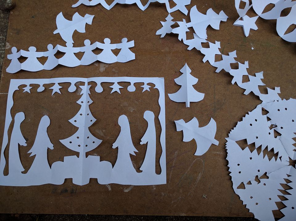 Garlands of little Christmas trees, angels, stars, or gingerbread people are easy to make by folding a piece of paper accordion-style, and drawing out whatever it is you’d like to cut in light pencil on the front. Just make sure both sides stay connected at some point, or you will end up with a bunch of little gingerbread men or angels running around loose and not holding hands together.