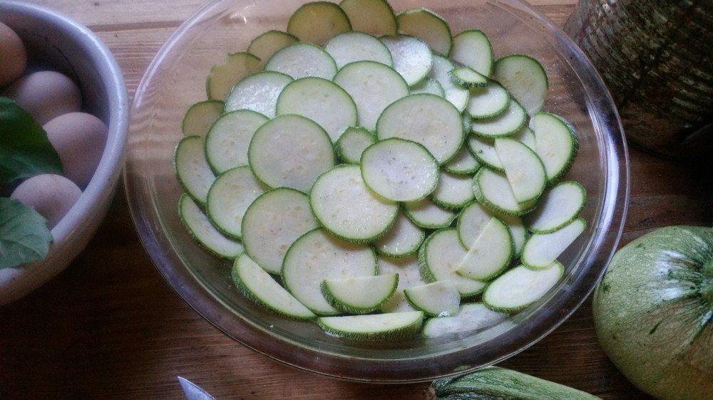 - Butter a pie pan and lay the zucchini slices in a single layer with over-lapping edges all over the bottom and sides of the pie pan. Sprinkle with salt and pepper.