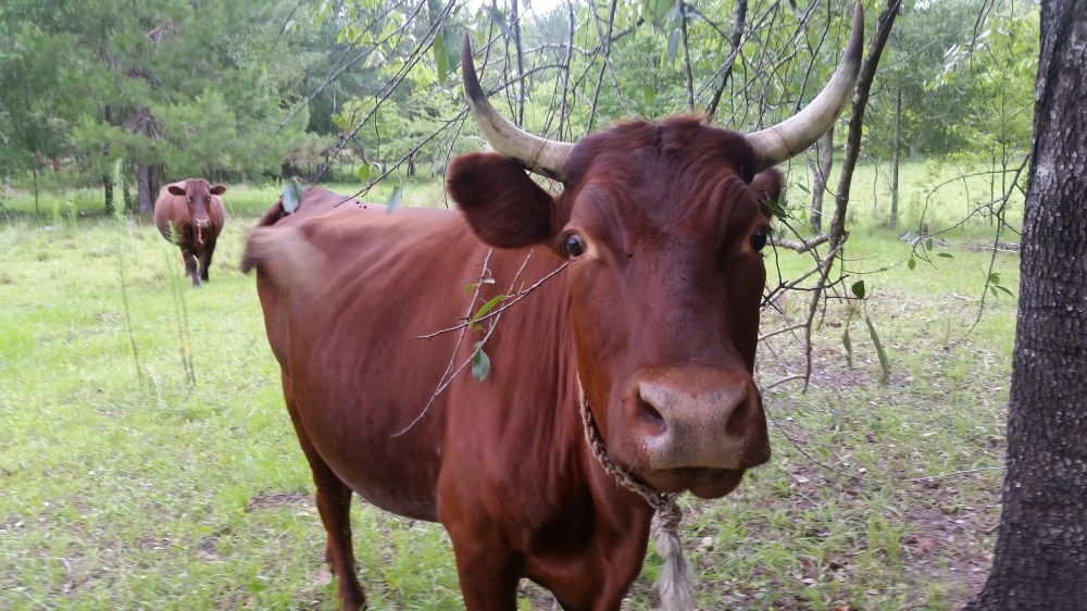 She was in an extra-bad temper because I had moved them, but it wasn’t a really lush pasture. To make up for it, I went ahead and staked out a fresh paddock to move them into in the evening. When she saw me get everything ready, and then NOT move the cows immediately, she decided something must be done. And that something turned out to be to park her large, bossy bottom at the gate, and moo demandingly at me with grass sticking out of her mouth.