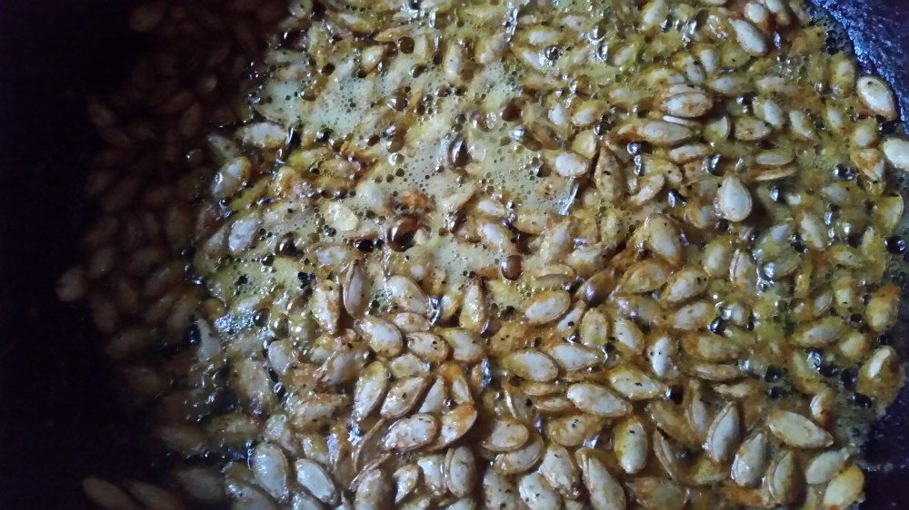 - Heat a cast iron frying pan until drops of water would sizzle if flicked onto the surface. Add the oil or fat, and then the pumpkin seeds.