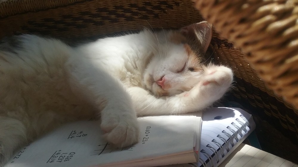 We were awakened later by Teasel pushing a container of colored pencils off the table in a hideous crash that jolted me awake with the impression that a tree had just fallen through the roof. At this sign of consciousness, Tabitha began mewling annoyingly, clearly indicating that both cats were ready to be tossed out into the hurricane.