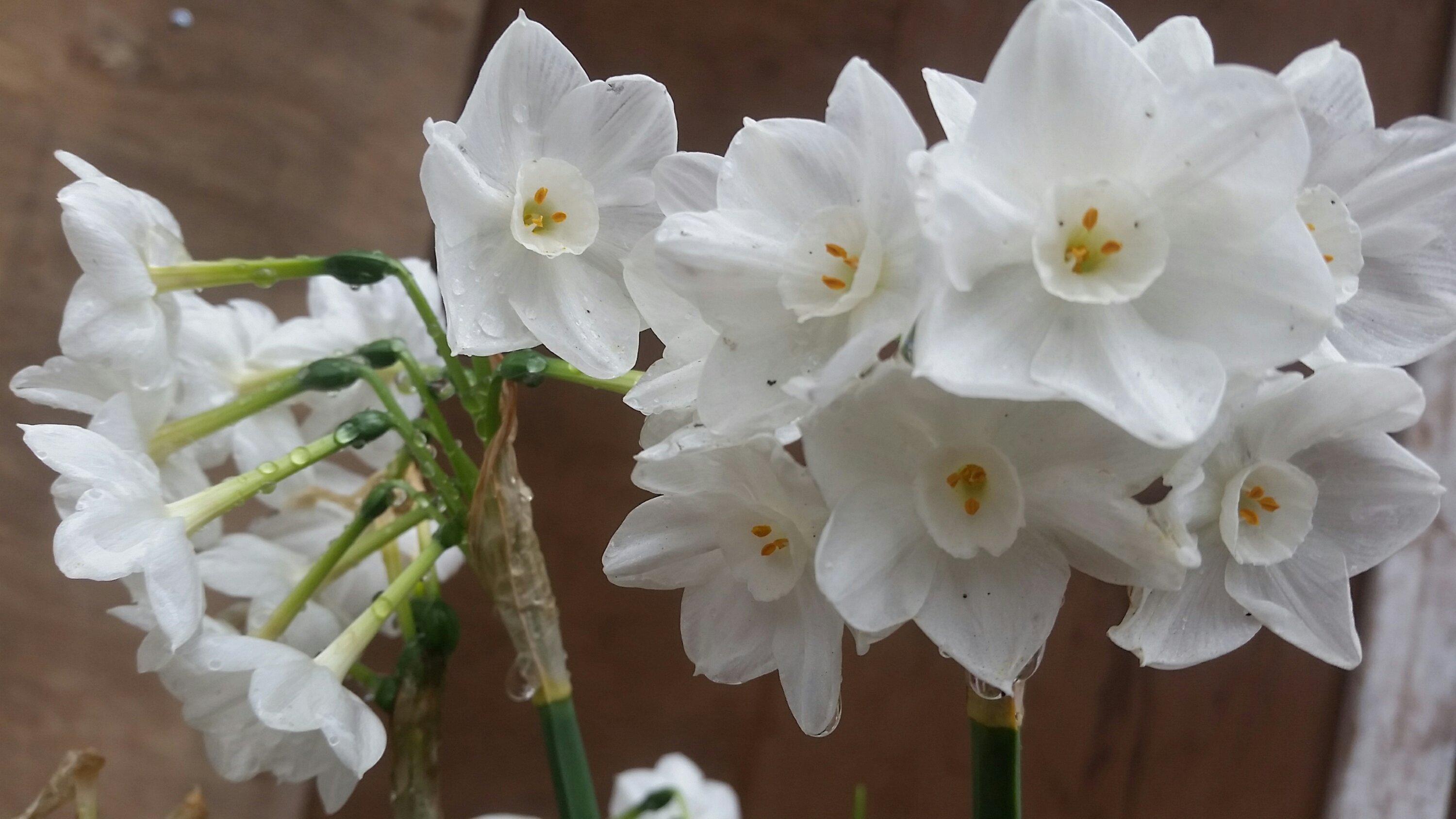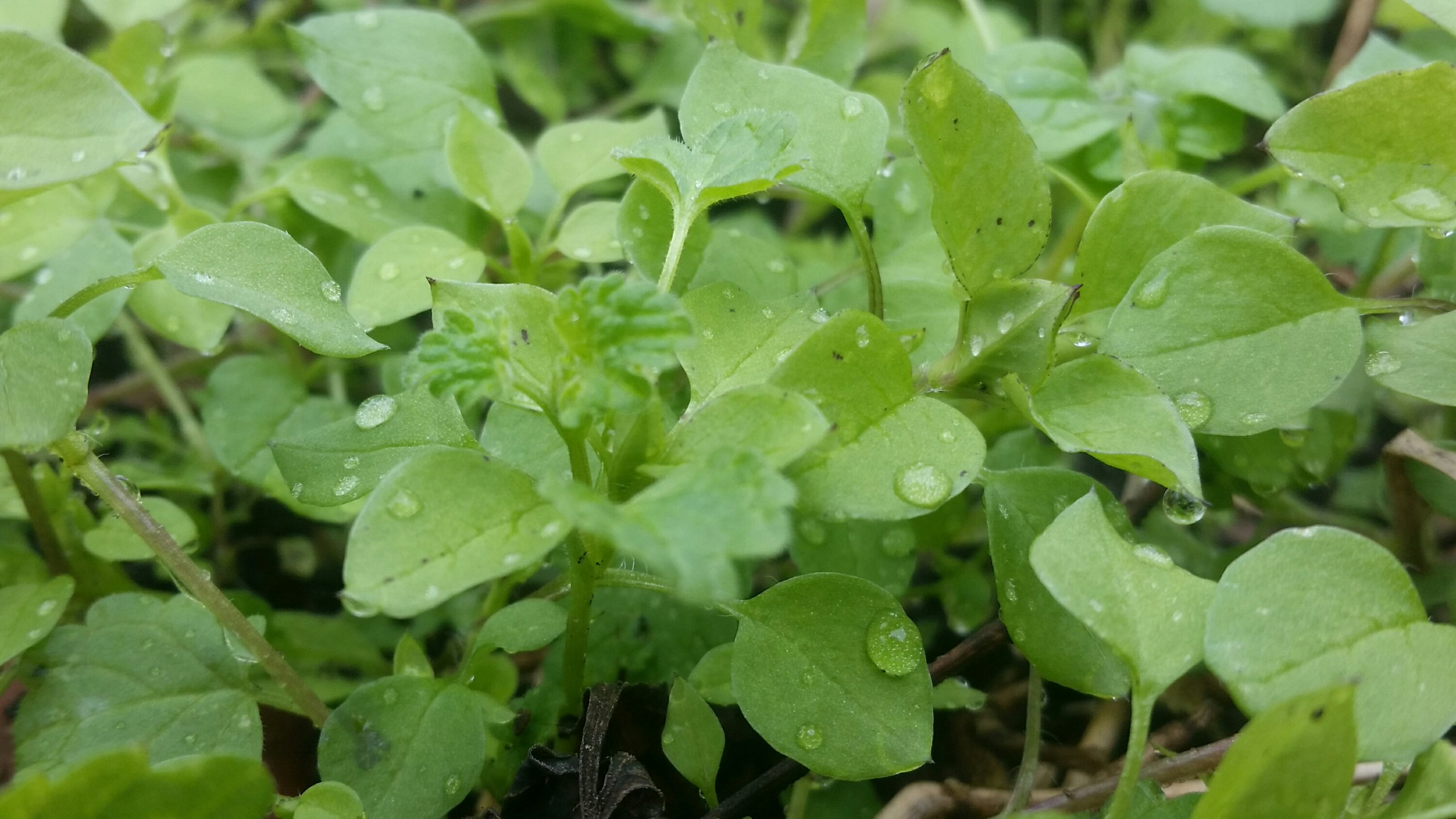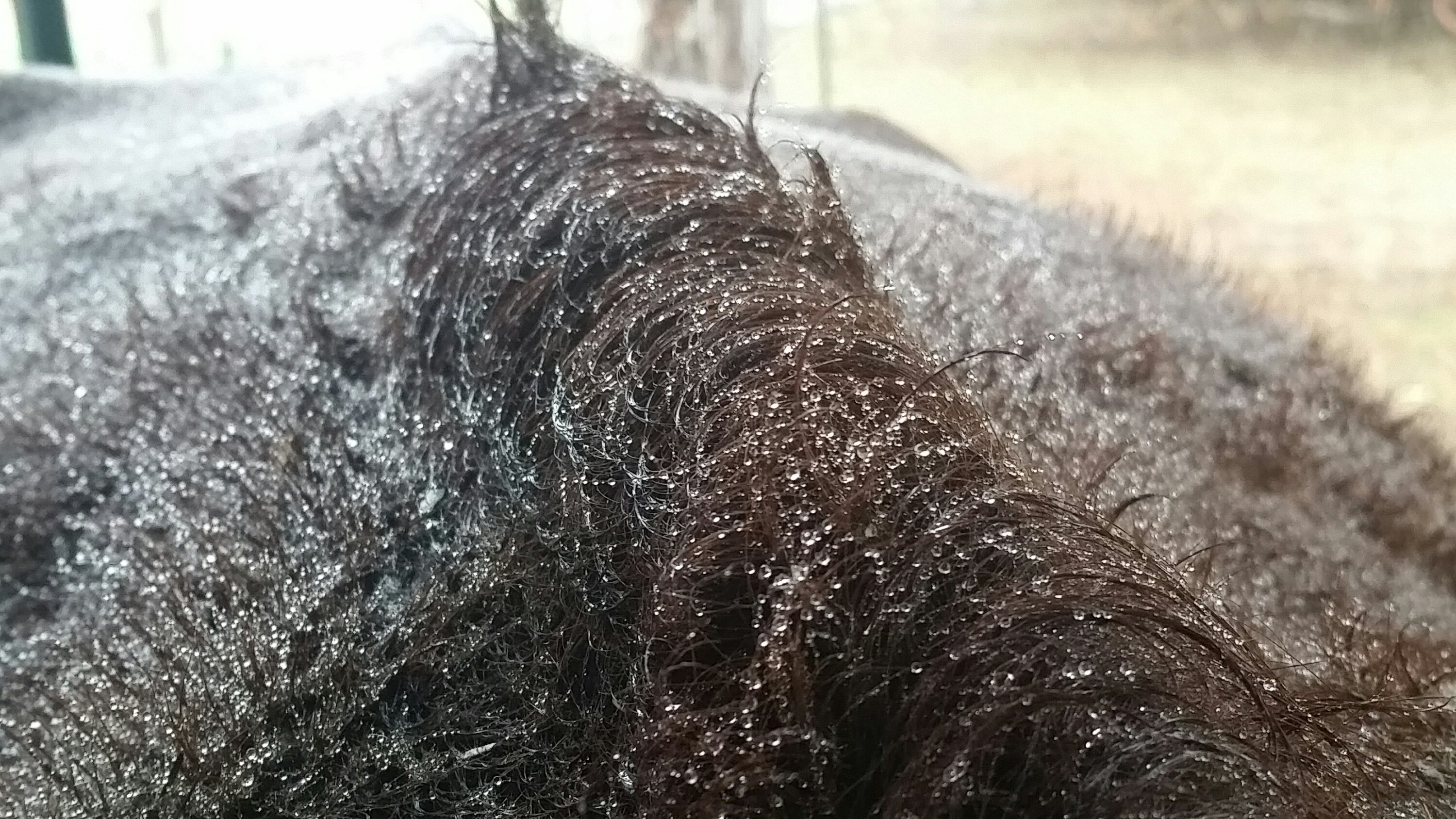 All night the wind came in roaring gusts across the pastures, and the morning felt bitterly cold.  Little droplets fluttered from the sky, and under my broad hat brim and into my eyes,  almost like small flakes of snow,  gathering in huge, pearly dew drops on the beautiful green tapestry of winter weeds in the fallow places of the garden, and studding the thick winter coats on the cow’s backs with a fine mist of diamonds.