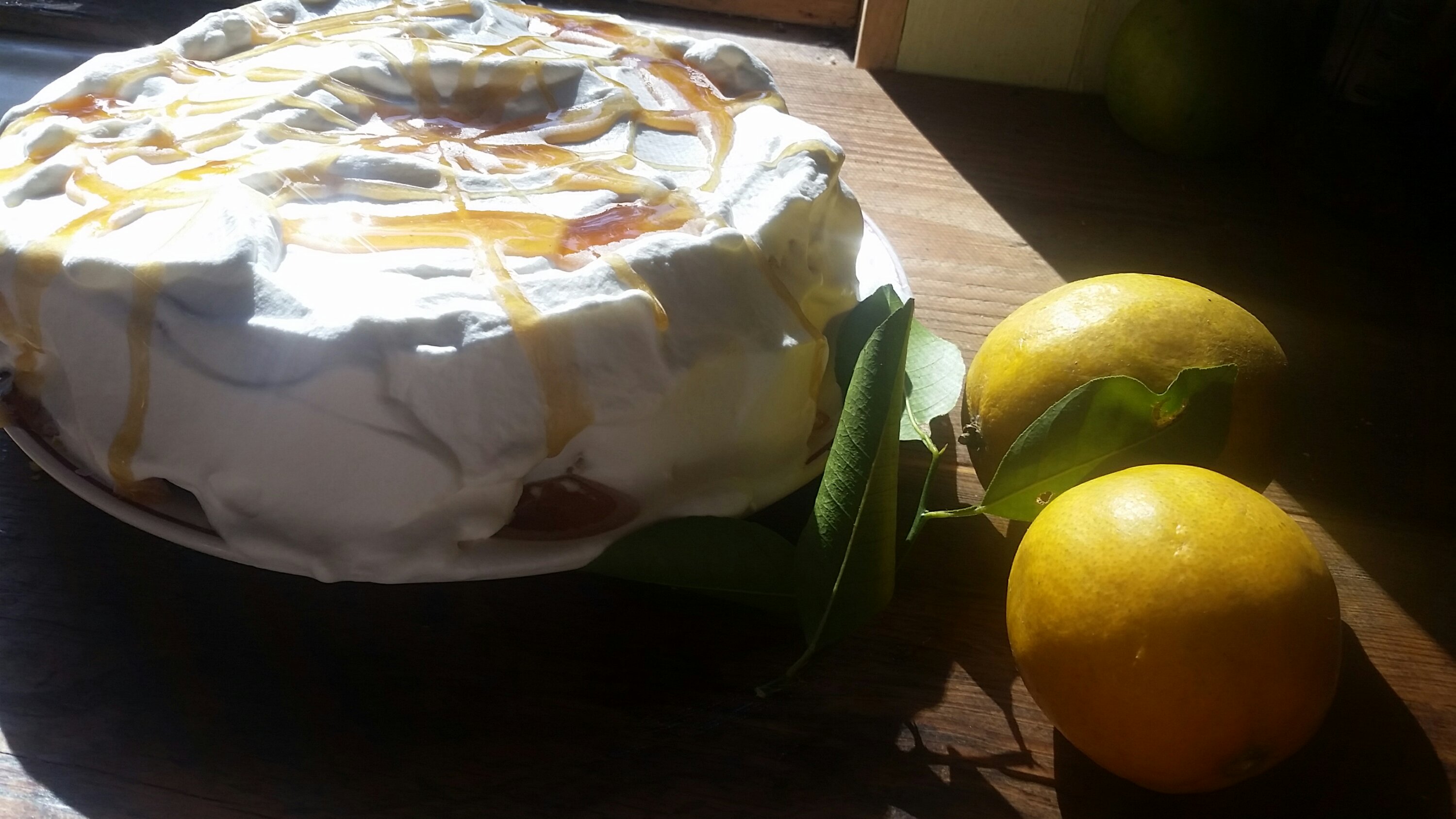 To assemble the cake, remove the cooked cake layers from the pans. Drizzle the lemon filling between the layers.  You can frost the outside with 2 cups of whipped cream,  and drizzle the leftover lemon filling on top in a sun pattern.  You can skip the whipped cream and use coconut oil instead of butter for a dairy-free version.