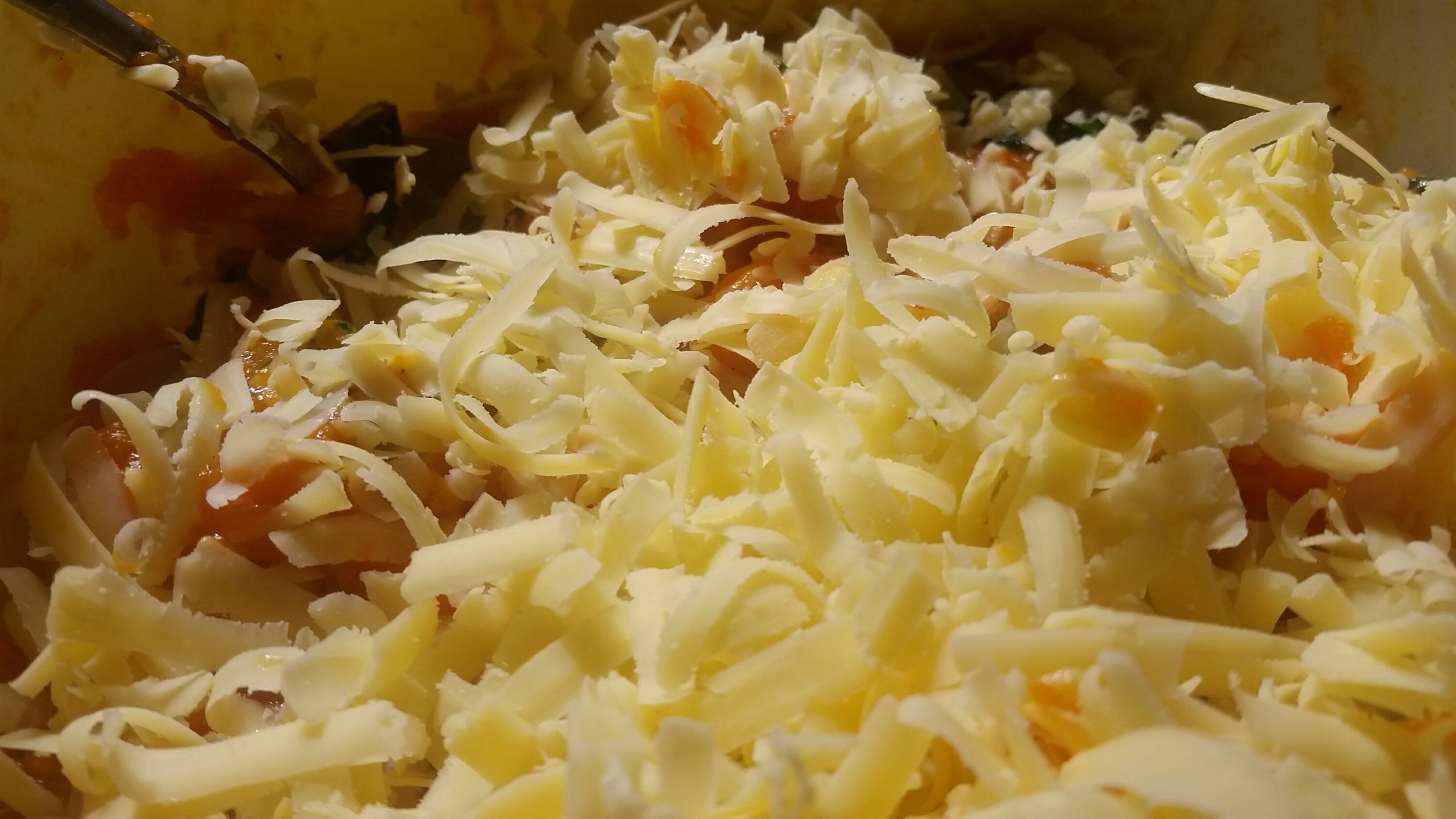 - Pour the butter and greens into the pumpkin, and stir in the eggs and shredded cheese. Season with salt and pepper and pour into a buttered casserole dish.