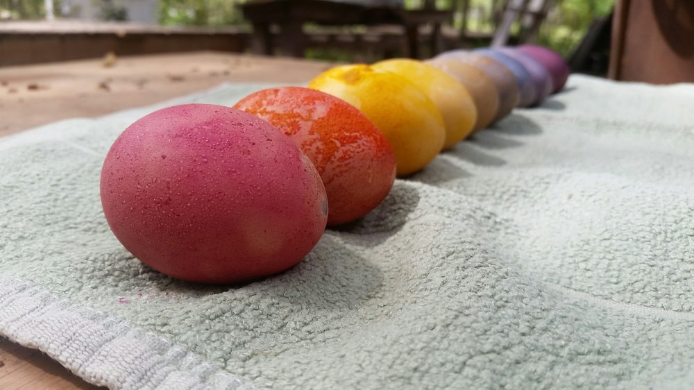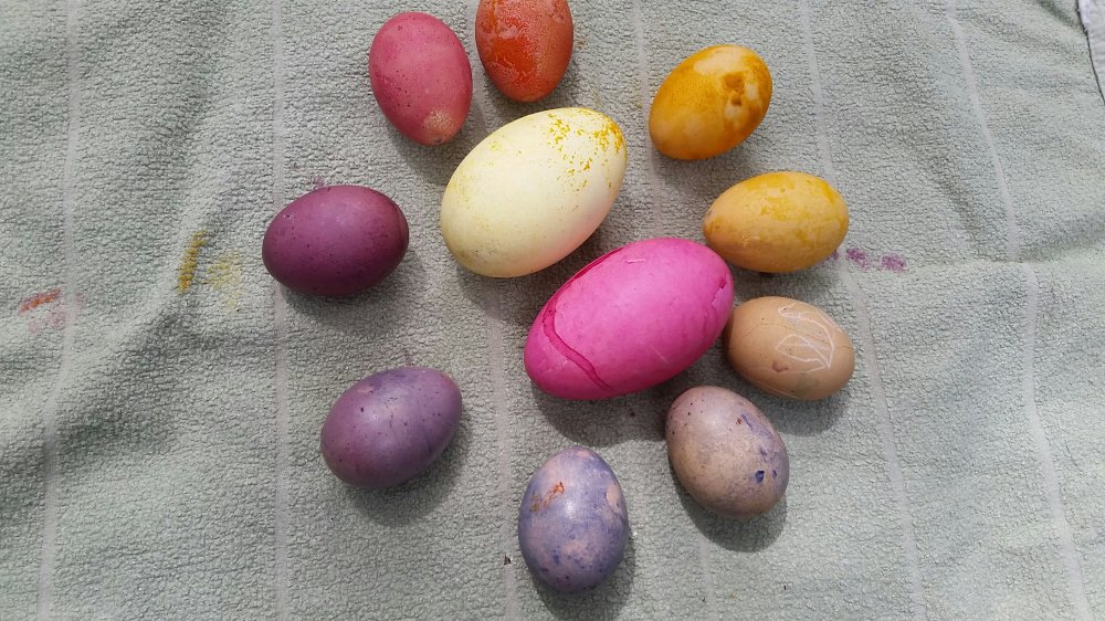 The natural dyes turned out very nice this year, made from beets, blueberries, and turmeric. We mixed the colors with interesting results. The goose eggs were a challenge because they were so large and made the dye cups overflow, but they made things interesting and it was nice to have a few white shelled eggs to dye.