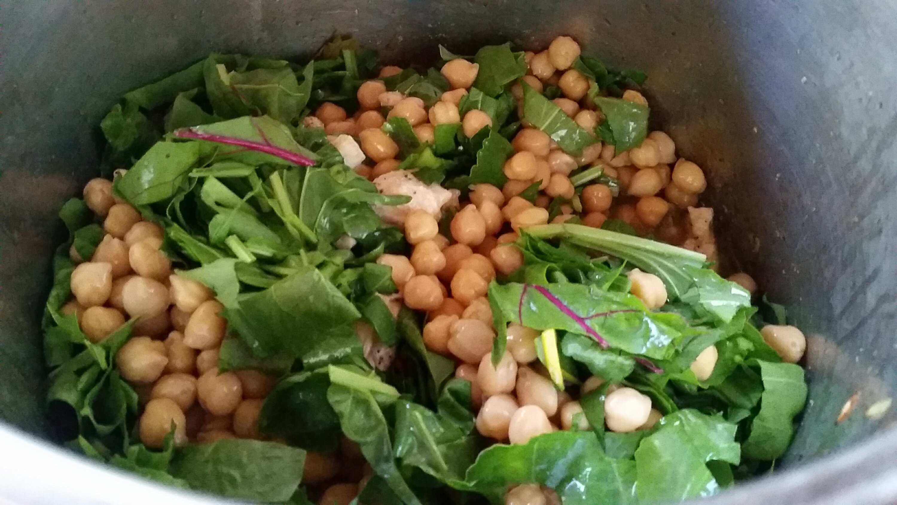 - Add back to the pot the chicken pieces, the cooked chickpeas and chopped spinach.