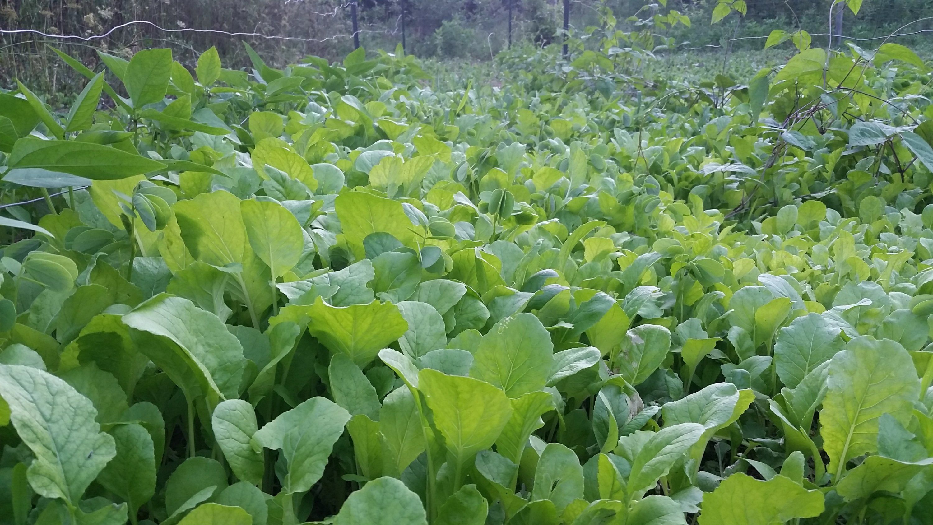 When I got closer, I realized the “weeds” were actually hundreds of Asian mustard green volunteers – mizuna, komatsuna, bekana, tatsoi, and even radishes that I had left to go to seed from the fall garden.