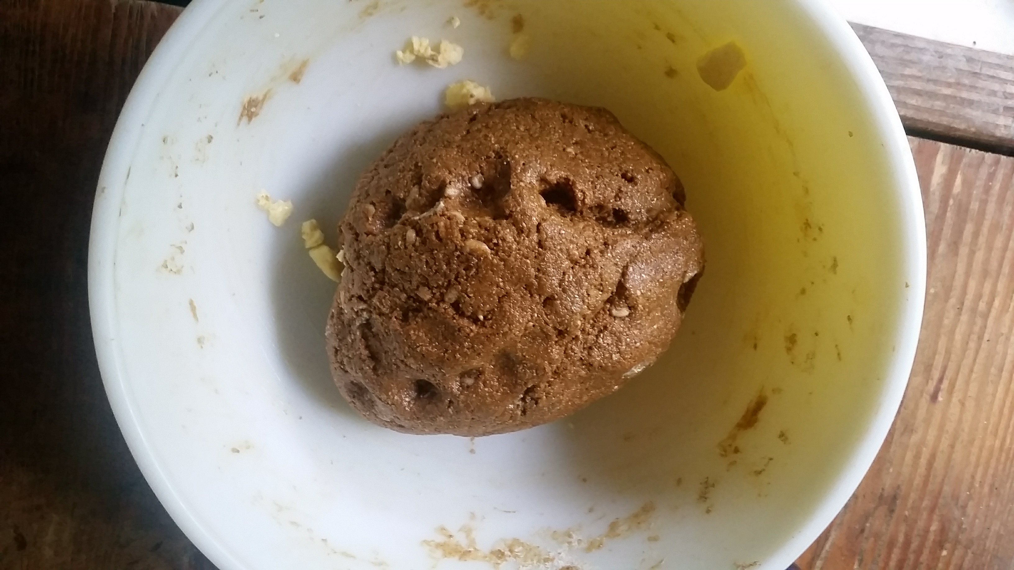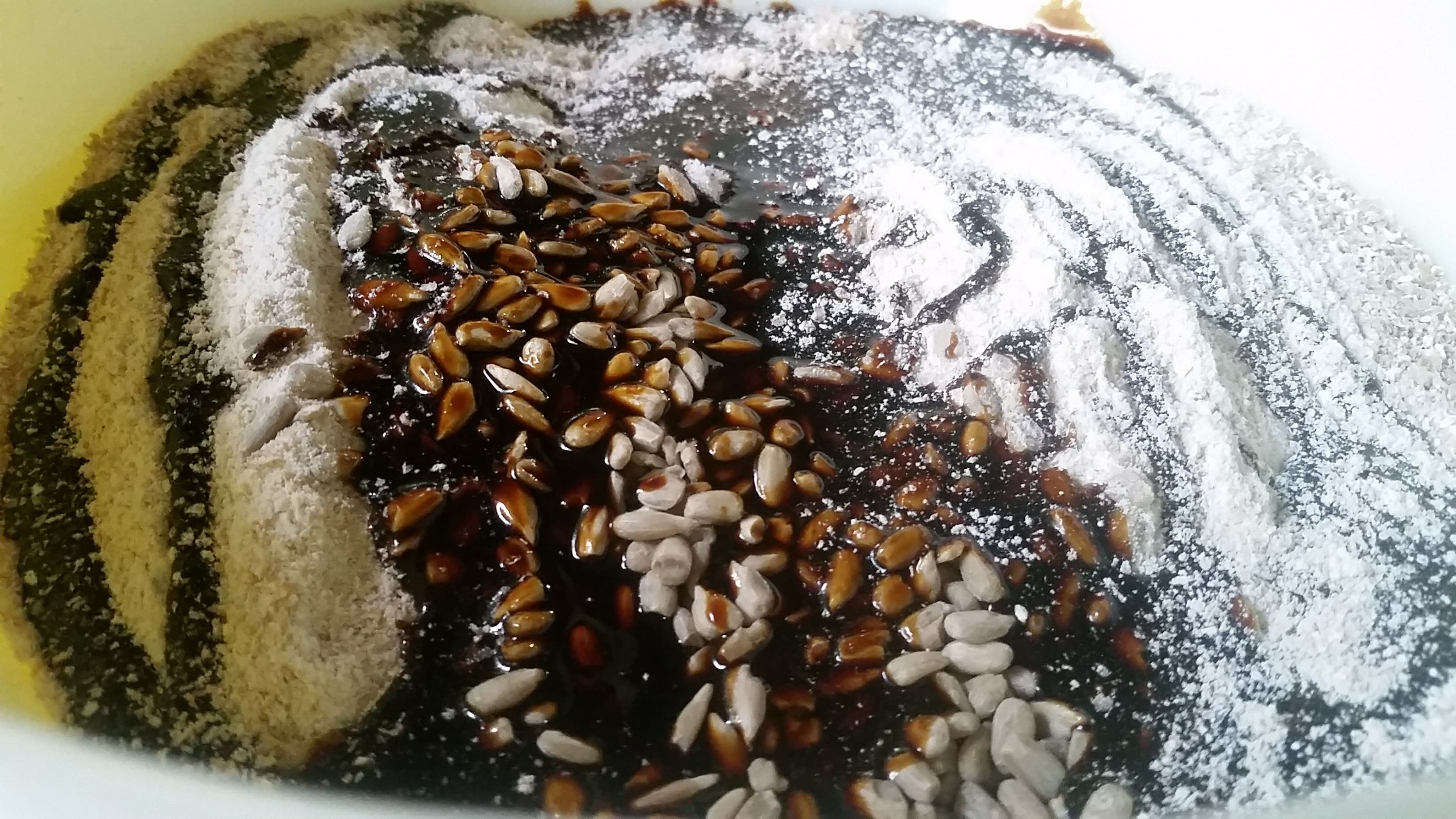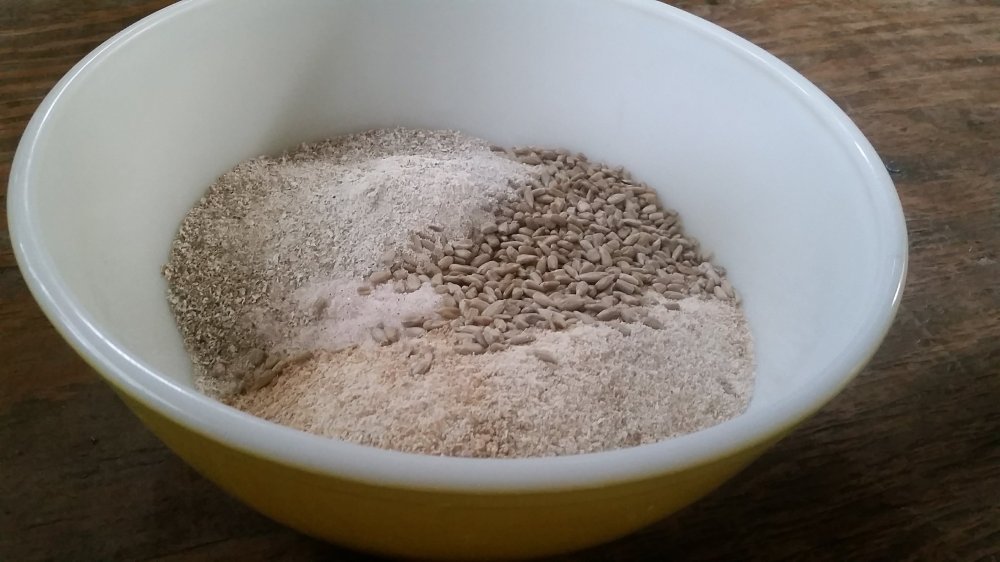 - In a large bowl mix together the flour, salt, sunflower seeds, and molasses.
