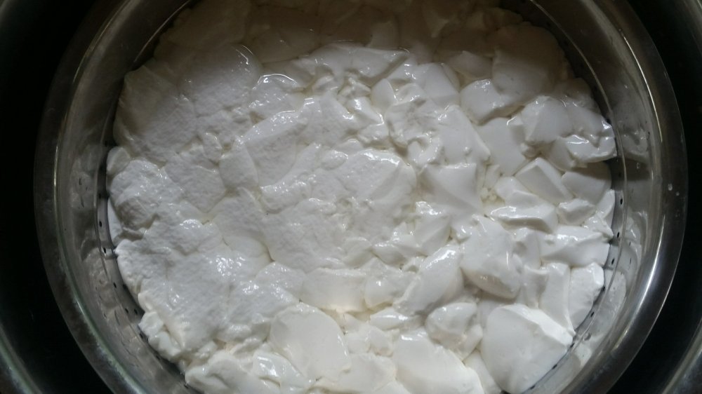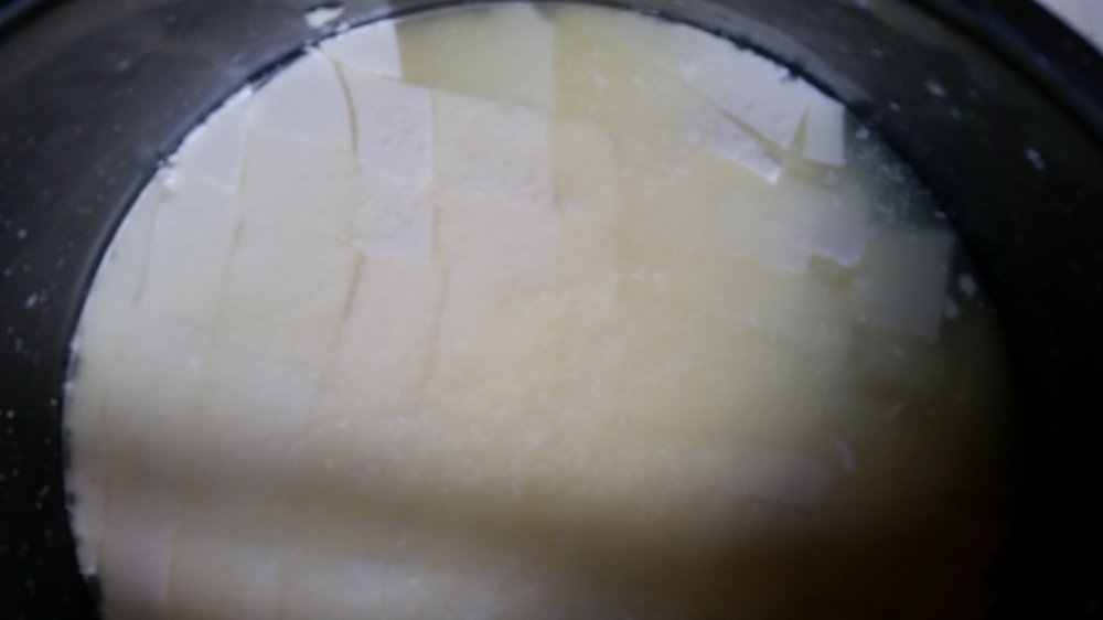 The curds are put into a cheese form in a bowl to shed more whey. The whey collects in the bowl after a while, leaving the tightening curds soaking in whey. Sometime that afternoon I heat up water and cut the cake of cheese curds into pieces. I soak the pieces in hot water for 5-10 minutes, and then stretch and roll them into mozzarella balls. The remaining whey is mixed with 1 tablespoon salt to make a brine, and the cheese is put in to soak and keep until eaten.
