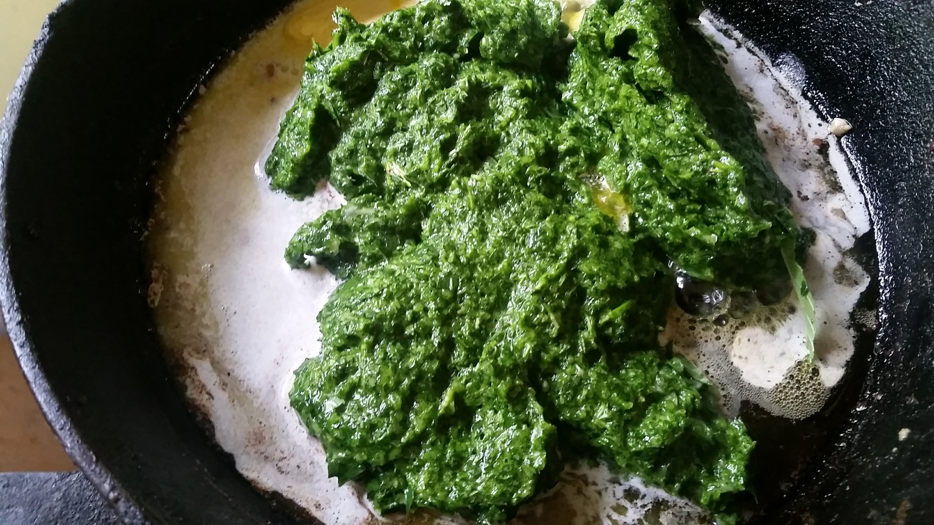 3. In a food processor or blender, finely chop the garlic, onion, basil and spinach. Season with salt and lemon juice.
