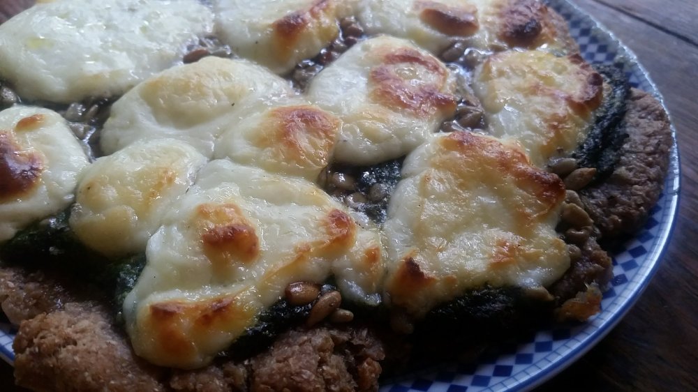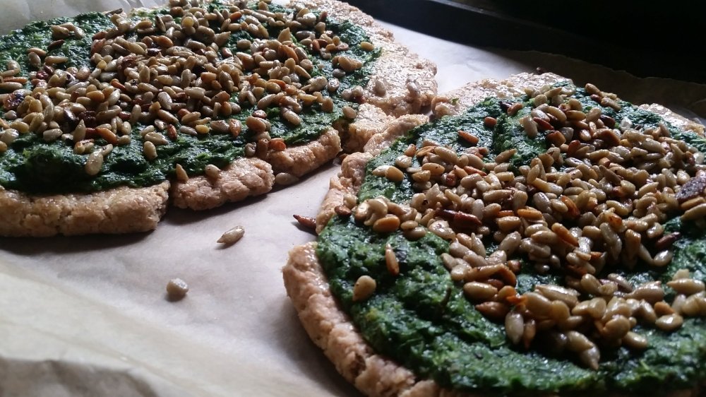 5. Assemble the pizzas: First add the pesto, then sprinkle with sunflower seeds. Add the cheese last and bake at 350F for 30 minutes. Depending on the cheese, you might have to bake it a bit longer for it to get toasted on top.