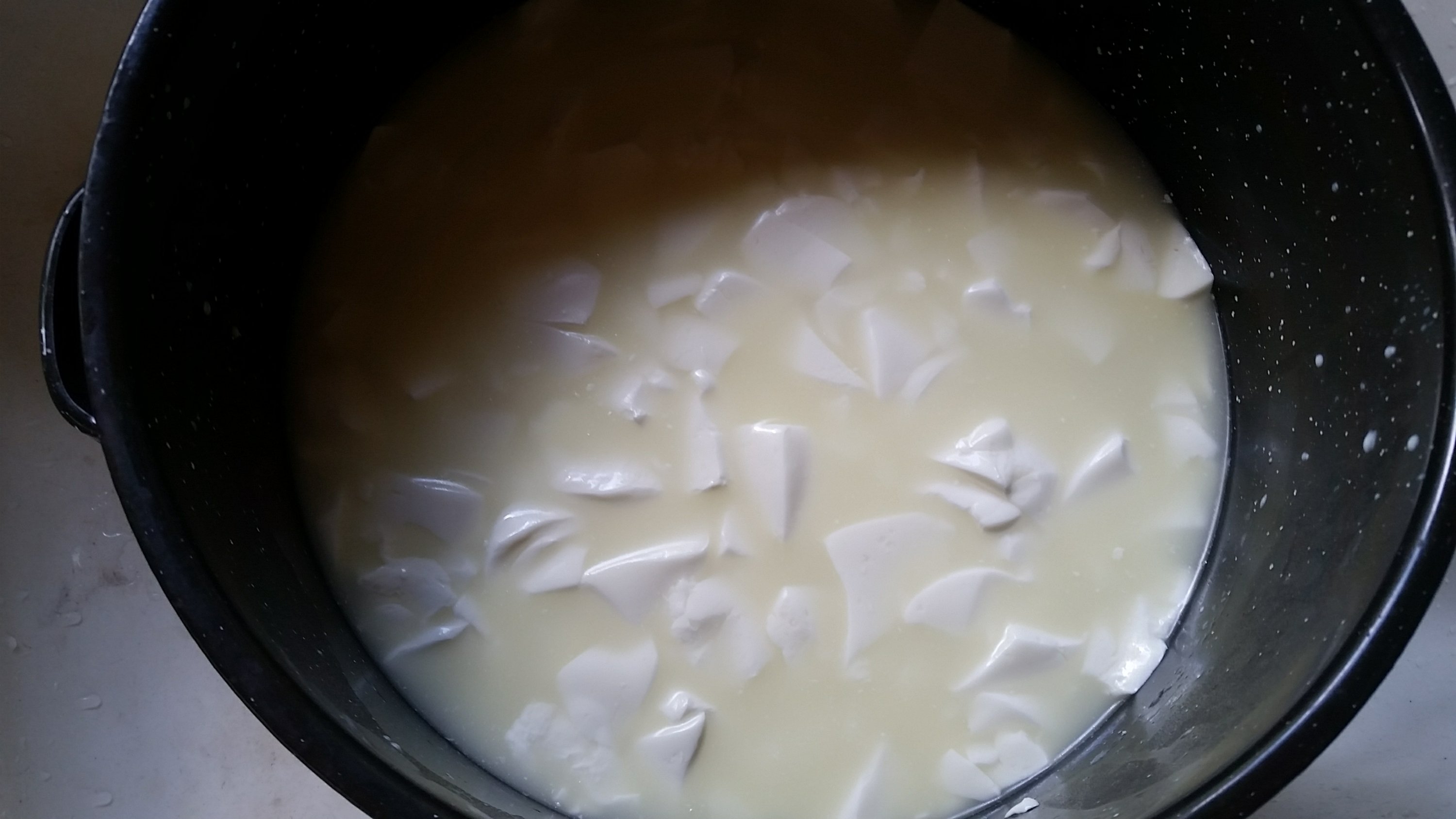In the morning I milk the goats, getting one and a half gallons of milk. I pour the milk, still warm, through a strainer and into an enamel pot and mix in 1/4 cup kefir for a culture, and add 3/4 of a rennet tablet mixed in water. I let it sit while I milk and move the cows. When I return, the curd has set and I cut it into 1 inch pieces.