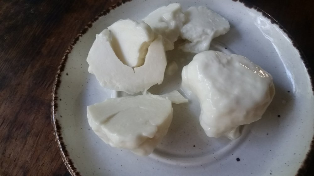 Being often rain-bound with too much milk on hand, I have been undertaking new adventures with cheese making. I’m finding that slow mozzarella, while not as easy as chevre, gets eaten more quickly being new and exciting for now.