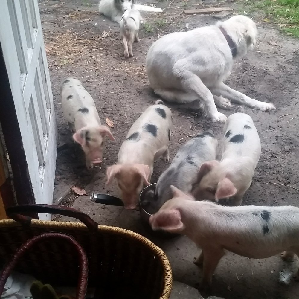 On top of it all, the new batch of piglets discovered the kitchen and have taken to marauding around the barn. Weeks ago they had slipped themselves out of the garden, and then weaned themselves by not following along when we moved their mamas to one of the wooded pig grazing lines. We tried over and over again to herd them over there, but they refused. And then one morning i woke up to this: