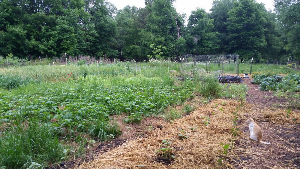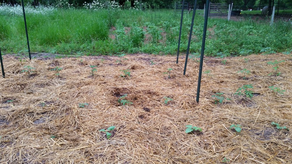The spring-planted potatoes look happy and are flushing out now that the nurse crop of rye grass was mulch down with old hay.