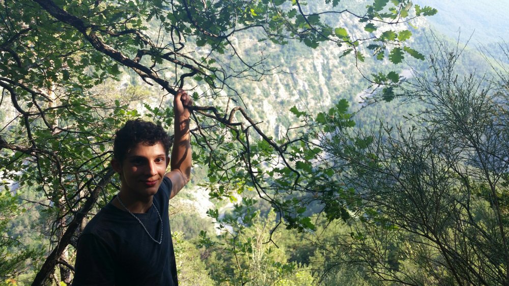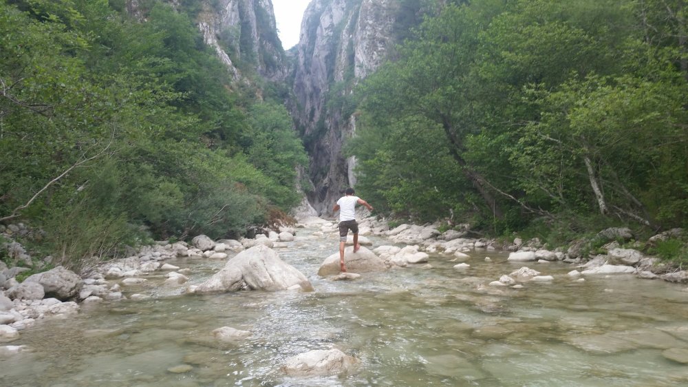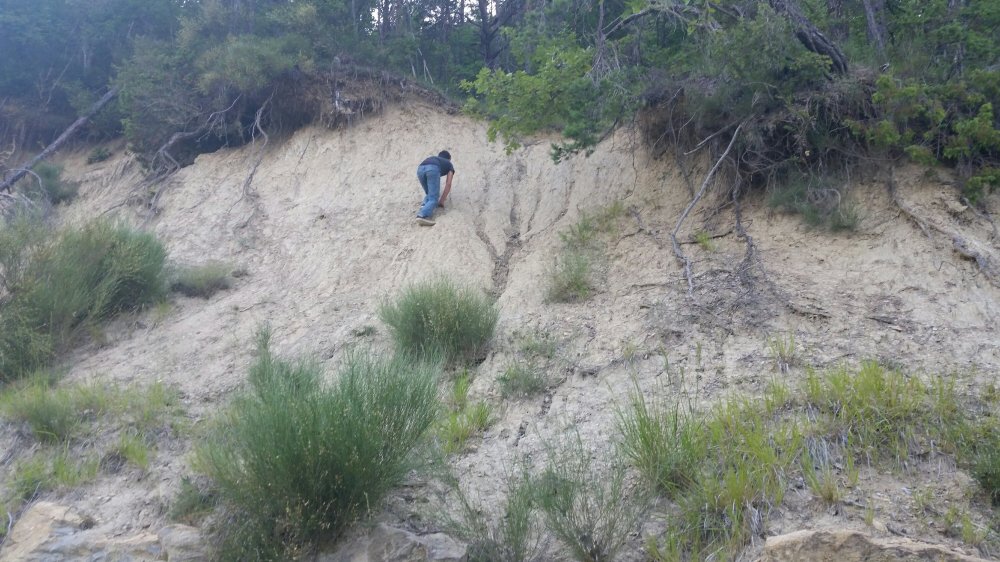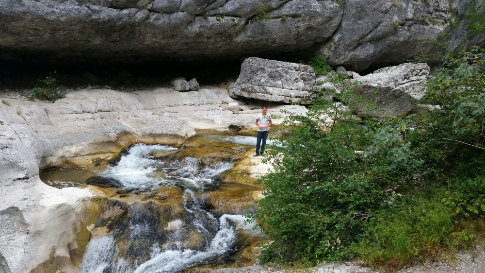Says staying here inspires him to find a cliff to jump off. We cross a little stream and climb up a very steep rocky incline.